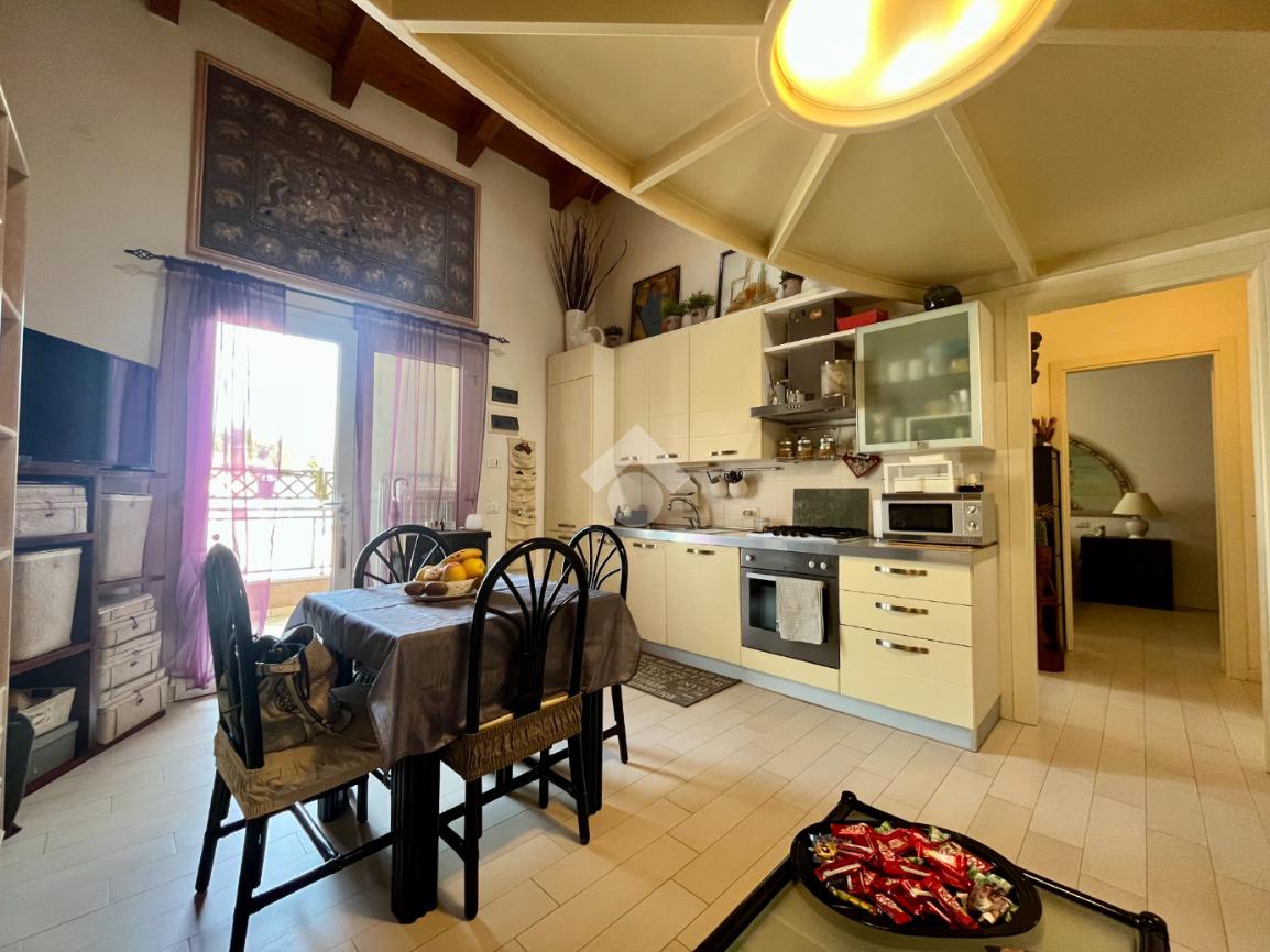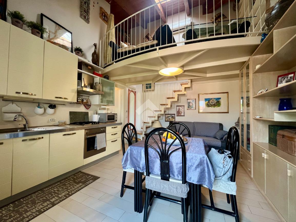 La zona giorno si apre in un luminoso open space con cucina a vista, un ambiente accogliente e funzionale.