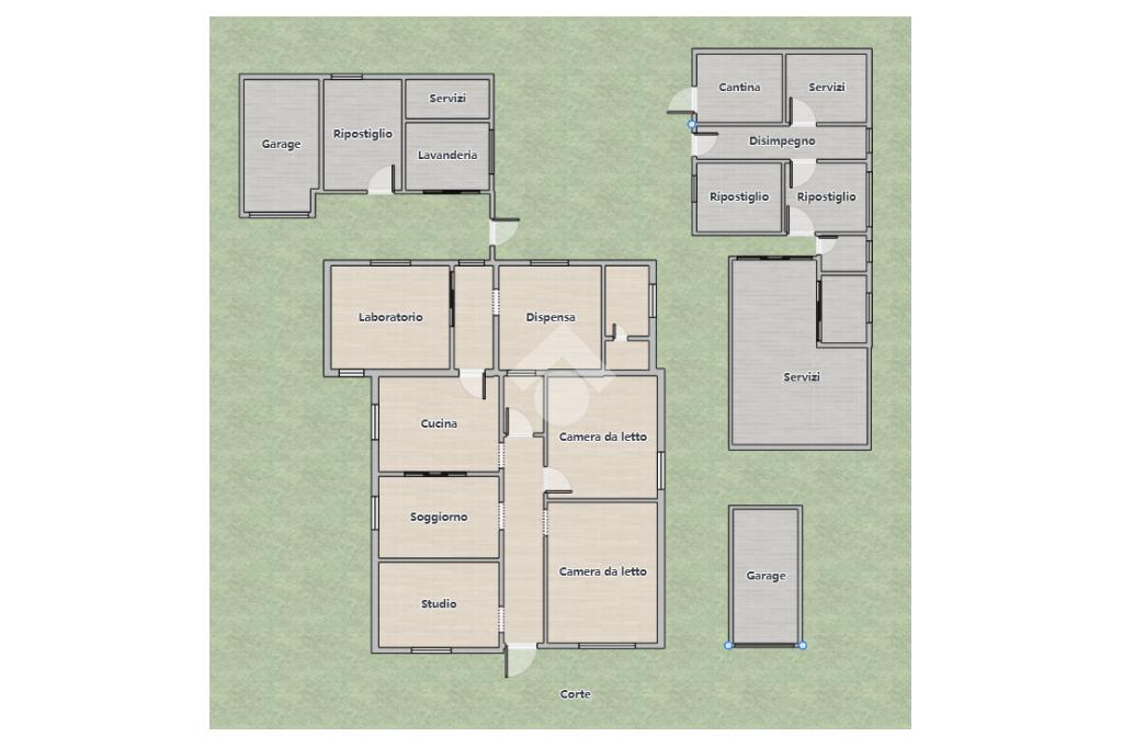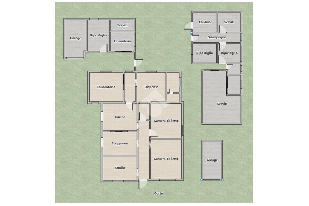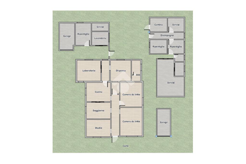 Completano l'interna un disimpegno, locale ora utilizzato come laboratorio con possibilità di ricavare una camera aggiuntiva, ripostiglio, antibagno e bagno funzionale.