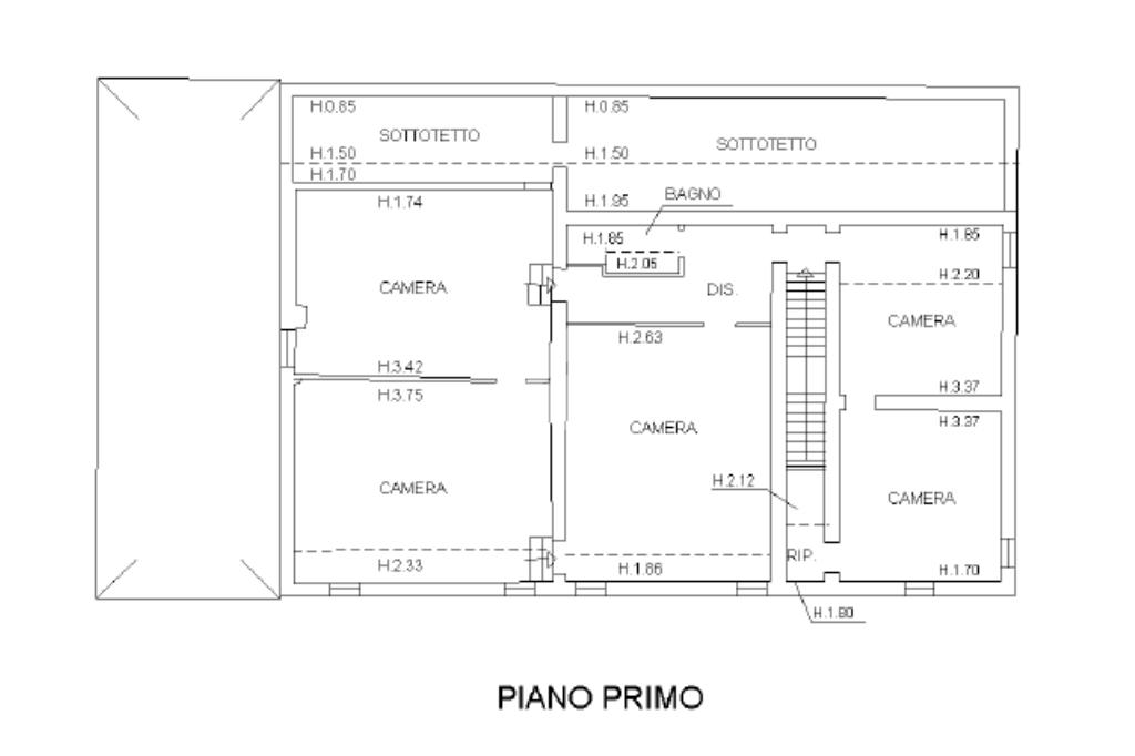 Salendo al primo piano, troviamo tre camere da letto di circa 30 mq ciascuna, un bagno, un disimpegno e altre due camere, con accesso al sottotetto tramite botola, offrendo spazi ampi e personalizzabili secondo le esigenze della famiglia.